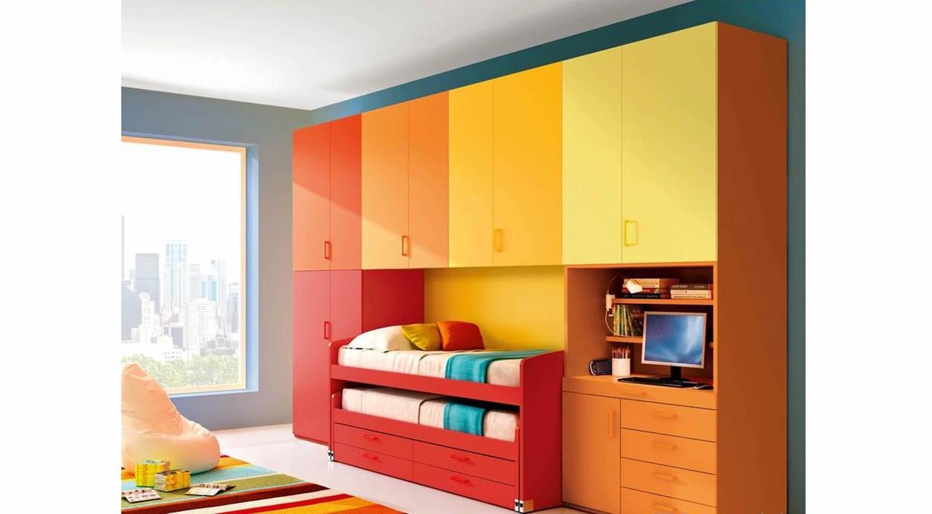 Ferrimobili propone un ricco catalogo di accessori da abbinare su misura: troverai letto, armadio o cabina armadio, scrivania, sedie e librerie. Porta valore estetico e tonalità vivaci nella stanza dedicata ai più piccoli con questa proposta, una tra le Camerette a ponte per ragazzi di Ferrimobili. Se cerchi spunti creativi per progettare al meglio la stanza dei tuoi figli, ti proponiamo la Cameretta 624 a ponte di Ferrimobili con finitura in melaminico. Questa proposta in melaminico ultima al meglio le qualità pratiche e l'estetica della camaretta, poiché è capace di coniugare ergonomia e sicurezza.