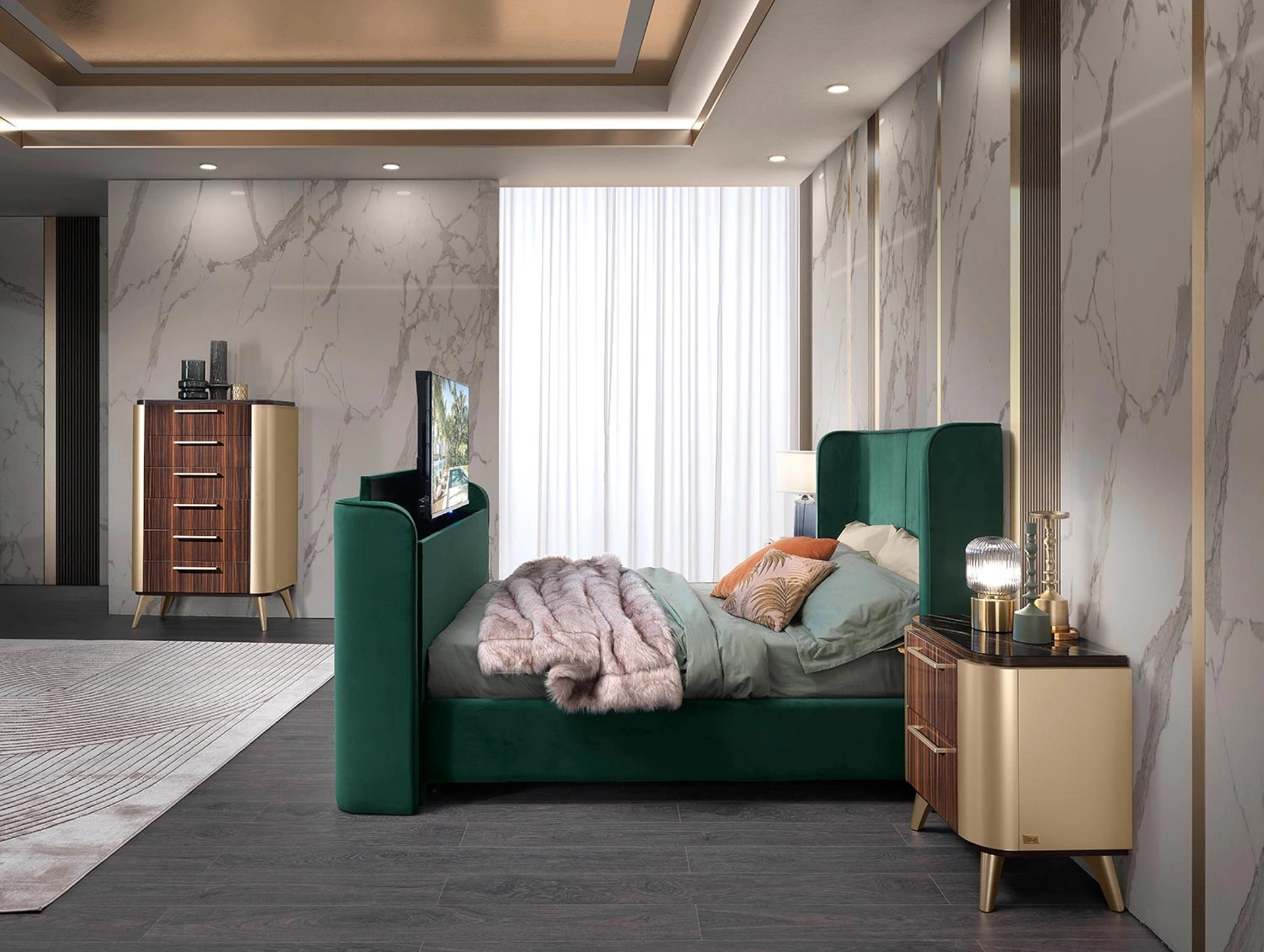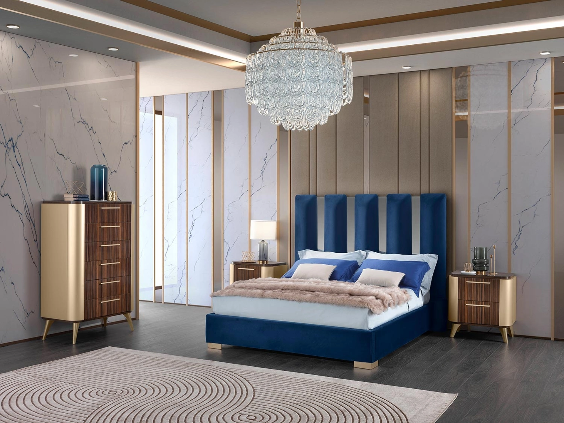 La zona notte include anche i Comodini: arredi contenitivi strategici che permettono di ordinare oggetti e avere a disposizione piani per appoggiare per diversi usi.