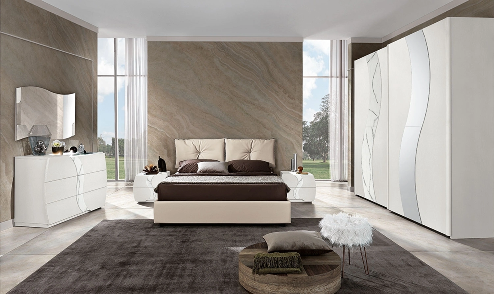 La camera da letto include anche i Comodini: mobili per contenere indispensabili che danno modo di sistemare oggetti e potere ususfruire di superfici per appoggiare multiuso.