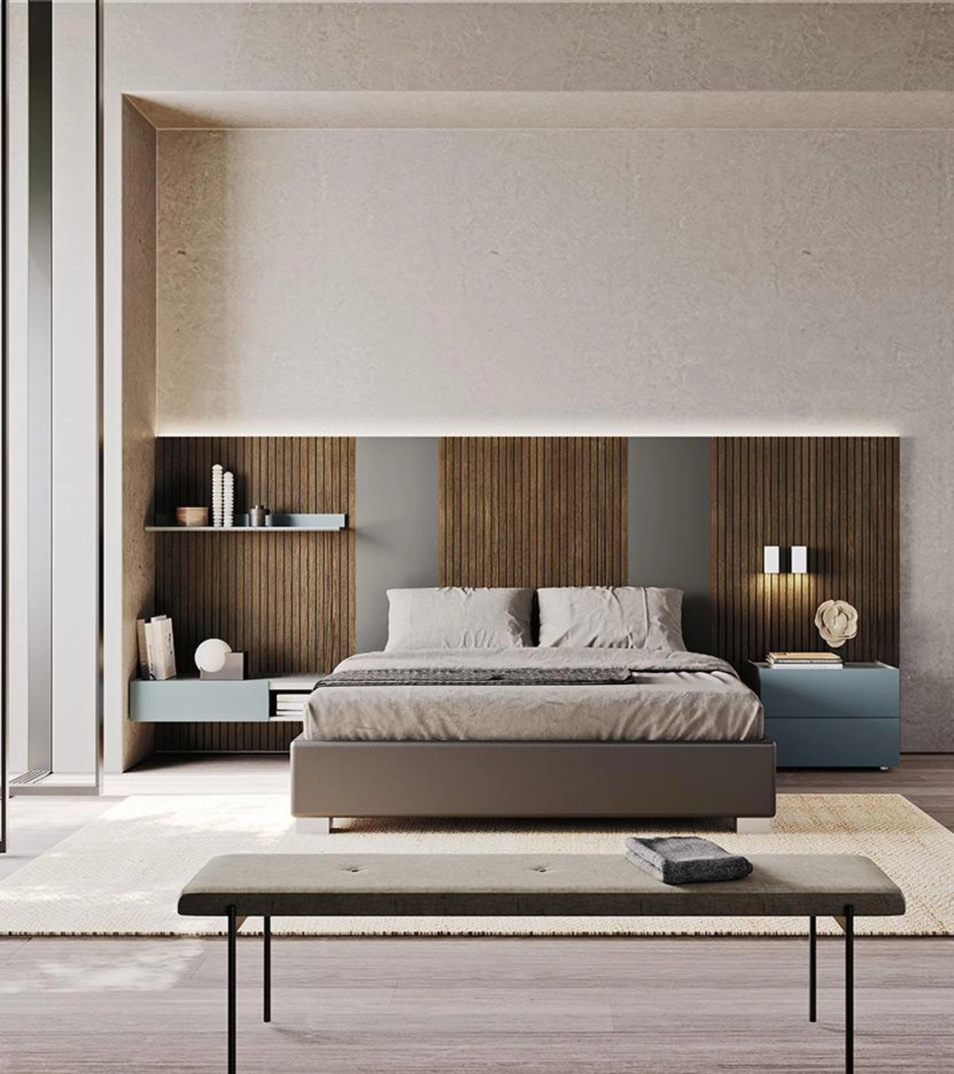 Vuoi organizzare la camera da letto? Eccoti il letto in legno Sistema Sipario di Mobilgam per spazi moderni.