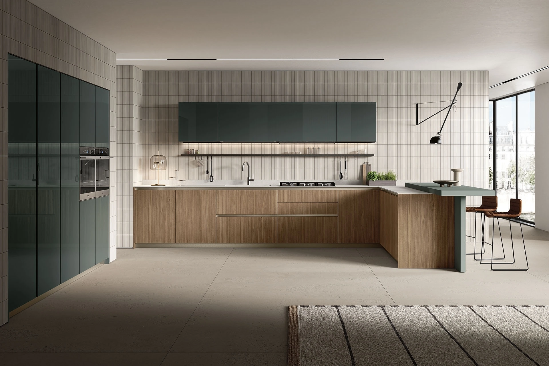 Clicca e scopri un mondo di Cucine Moderne con penisola: la cucina Lungomare Plus 09 Colombini Kitchen in legno ti attende!